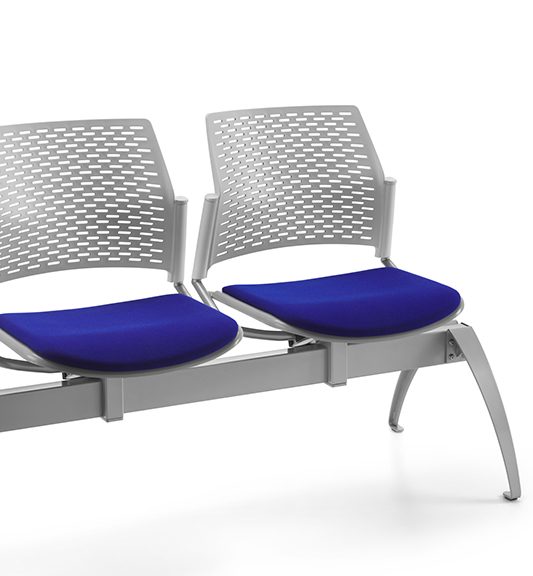 Siège avec assise et dossier en copolymère disponible en trois couleurs. Poutre métallique modulaire à deux ou plusieurs sièges. Structure de base en métal avec des pieds arqués ou trapézoïdaux ou en forme de « T ». Support de siège/dossier en métal. Fixation du siège métallique à plusieurs positions sur la poutre. Les pièces métalliques sont toutes peintes.