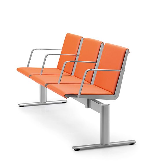 En option: prises USB sur les accoudoirs spéciales à la demande du client, panneau d’assise ou panneau d’assise + dossier ou façade rembourrés et recouverts, pied chromé pour les pieds en « T », entretoises murales et/ou îles opposées, accoudoirs droit et/ou gauche en métal peint fixés directement sur les sièges, accoudoirs métalliques en « T » fixés sur la poutre, tables basses en Alfawood wengé ou hêtre MDF.